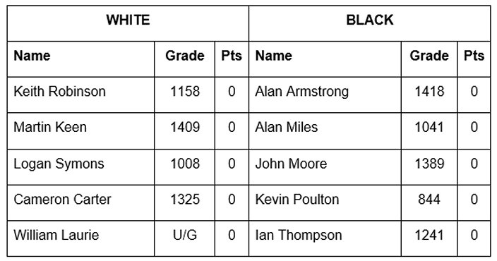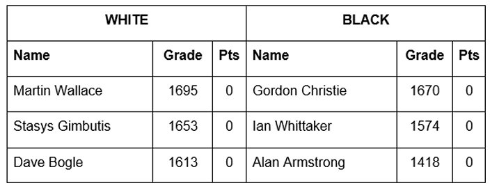 Selkirk B's first match of the season did not go according to plan. On board 4, Cameron Carter generated an attack that was enough to overwhelm Gala's Paddy Lynch, but the other boards all lost despite very good starts to their games.The result was a 3-1 victory for Gala, and the full details are here: