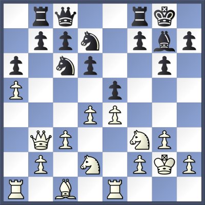 7. Re1 Nc6 8. e4 Qc8 9. c3 Bh3 10. Qb3 Bxg2 11. Kxg2 O-O 12. Nc4 a6 13. a4 Rb8 14. a5 Qe6 15. Ncd2