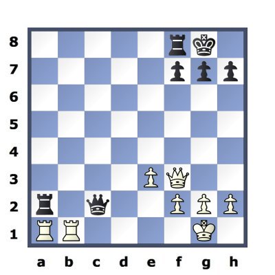 - Taking the Black Rook (Rxa2) allows the Queen to take the b1 Rook, again checkmating next move