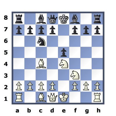 Black can then take the pawn on e4, and when White retakes with his Knight (diagram 2) Black has the resource of advancing his d-pawn to d5, forking the Bishop and the Knight. This does not bring about a winning advantage, but Black has regained the piece and his development is freer than White's. Advantage to Black.