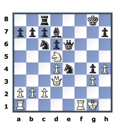 White captures the e4 Knight with his Queen, making Black capture back (diagram 2). White can then deliver the Knight fork with Nf6+, and (after capturing the Black Queen) ends up with a material advantage.