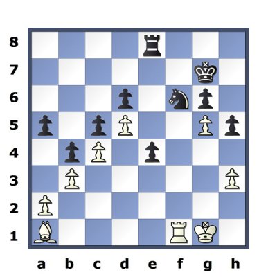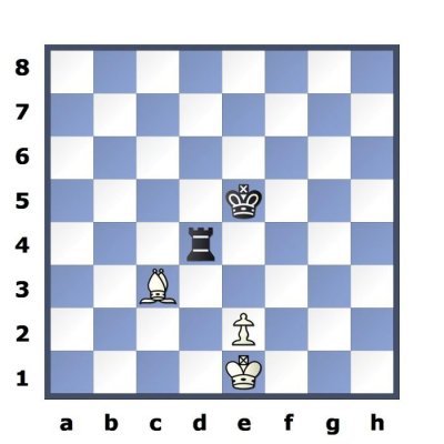 With the Rook unable to move, you might think that capturing it would be the best move. Not so, for after the Bishop takes the Rook and the Black King takes the Bishop, White is left a pawn up - which in this position cannot be forced through to promotion to a Queen.
