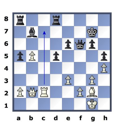 Nor can Black move his King out of harm's way, as White would capture the now undefended Black Queen with his own Queen.The only hope would appear to be capturing the White Knight with the f-pawn (fxe6), as in diagram 2 - but that allows the White Rook to invade with Rc7+, forcing the Black King away from the defence of his Queen. The Black Queen is lost.