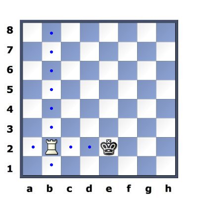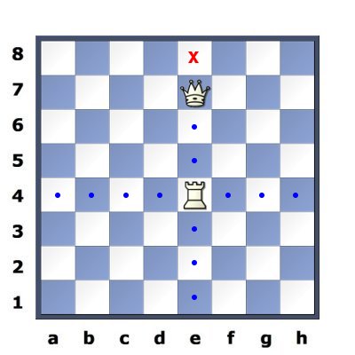 In addition, the square e8 is not available to the Rook; the Rook's path to e8 is blocked by the Queen, and (with the exception of the knight) pieces cannot jump over other pieces.