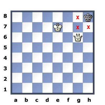 In this example, Black is not in check from the White Queen, but that same Queen is preventing him from moving anywhere. Draw by stalemate.
