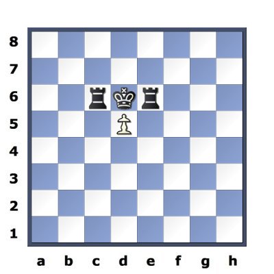 In this diagram, the Black King is not in check (i.e. under attack) from the pawn, and the pawn cannot proceed to the square occupied by the King. However, the pawn can capture either of the two Rooks as they are diagonally forward of the Pawn.